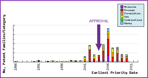 Represents the timing of the earliest priority filing date for each patent family identified for this molecule as well as the type of claims found in the applications. Note the consistent patenting by generic companies post-approval in the area of molecular form, process and formulation.