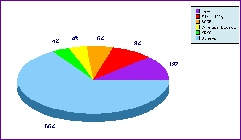 A representation of patentees who have filed the most patent families for this INN. Note that generic competitor Teva is the highest individual filer in the top five, their patenting activities focusing primarily on molecular form, process and formulation. The patenting focus of BASF relates to the synthesis of Duloxetine. Cypress Bioscience's has centred on the manufacture of a competing SNRI, Savella® (Milnacipran) - most of their patenting actives relating to Duloxetine are for general use of a SNRI. Of particular interest are families identified which claim use of a SNRI in treating fibromyalgia.
