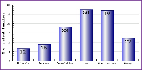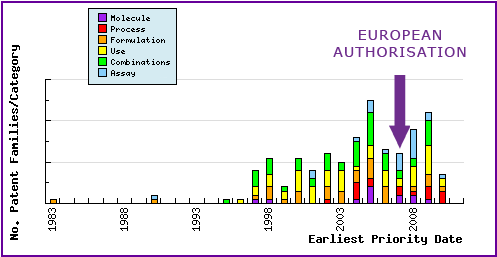 This graph represents the timing of the earliest priority filing date for each patent family identified for this molecule as well as the type of claims found in the applications. Note the consistent filing of patent applications in the area of combination, use and analytical method (assay) patents.