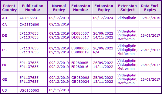 A third identified patent family (priority US32574400P) contains patents with normal expiry dates of 2021 and SPC applications potentially extending to November 2022, based on the marketing authorisation for the fixed dose combination of Vildagliptin and Metformin. Patents within this family claim ‘combinations’ comprising DPP-4 inhibitors, specifically Vildagliptin, and a further anti-diabetic compound for simultaneous, separate or sequential use. Certain patents within the family specifically claim fixed-dose formulations comprising Vildagliptin in combination with Metformin and as such are considered to be constraining for marketed products containing this fixed combination.