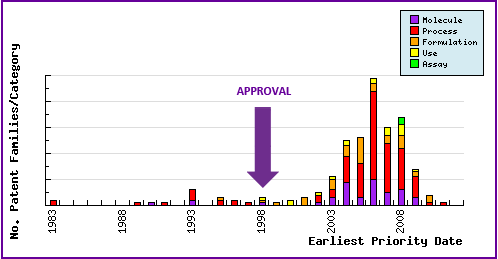 Represents the timing of the earliest priority filing date for each patent family identified for this molecule as well as the type of claims found in the applications. Note the consistent filing of molecular form and process patent applications since the initial approval of Montelukast in 1998, confirming the preferred strategy of generic manufacturers is to circumvent the crystalline form patent.