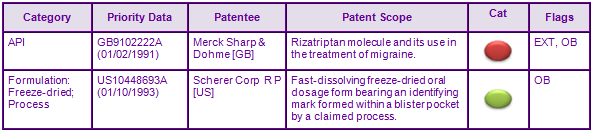 Figure 2: Key Patent Indicator; the most significant patents protecting products containing Rizatriptan