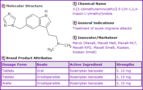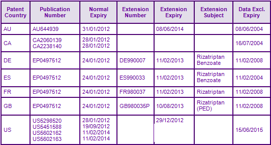 The following data is extracted from GenericsWeb Pipeline Patent Intelligence and is intended to give a brief outline of factors affecting the potential launch of generic equivalents of Merck’s migraine treatment Rizatriptan (Maxalt®). Rizatriptan products had global sales of USD $550m in 2010.