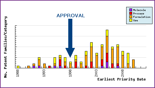 This chart represents the timing of the earliest priority filing date for each patent family identified for this molecule as well as the type of claims found in the applications. Note the strong responsive patenting by generic companies post-launch, particularly in the area of formulations.