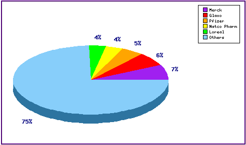 This chart shows a representation of patentees who have filed the most patent families for this INN. Note the prominence of relevant applications filed by manufacturers of competing triptans, Pfizer (Eletriptan) and Glaxo (Naratriptan, Sumatriptan) whose scope overlaps with Rizatriptan; as well as the diversity of applicants represented by the significant portion outside the top five.