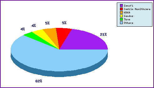 A representation of patentees who have filed the most patent families for this INN. Note that 21% are by the innovator Sanofi and the prominence of generic filing in the top 5.