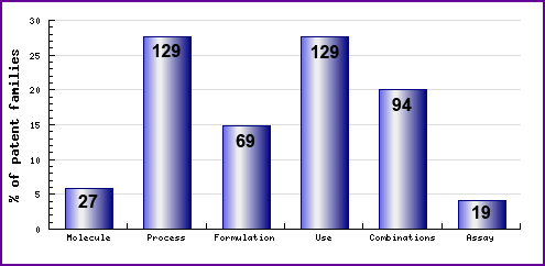 The types, number and relative distribution of patents that have been filed for Irbesartan obtained via a comprehensive patent search (Pipeline Developer report). Note the existence of equal number of process and use patents filed. Of the process patents over 50% of the patents filed relate to intermediates, suggesting broad patenting due to the similar molecular structures of some of the ‘sartan’ drugs. The use patents cover an extensive range of indications which often differs to the currently marketed indications.