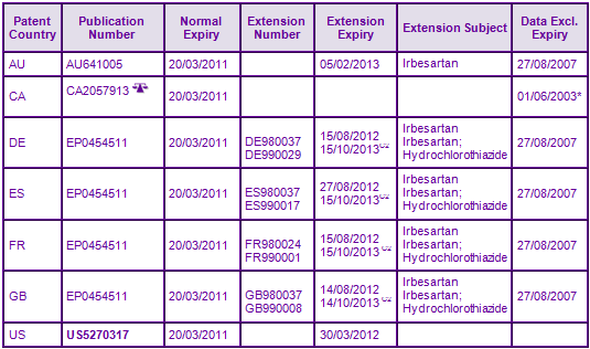 Patent protection for the Irbesartan molecule (FR9003563A) expired in Canada in March 2011 and the US in March 2012 after benefiting from six months of paediatric extension to a 197 day s156 extension (see Figure 3). In Europe, patent protection of the Irbesartan molecule has been extended by Supplementary Protection Certificates (SPC) which expire in August 2012. However, the Spanish portion of EP0454511 only claims processes for the preparation of Irbesartan and as such may be able to be circumvented. Additional SPCs protecting the combination of Irbesartan and Hydrochlorothiazide have been granted and expire in October 2013, however GenericsWeb’s proprietary SPC analyser had identified the basic patent as being a ‘C2’ category, suggesting that the claims do not specify or identify all components of the combination that is the subject of the SPC, and therefore the SPC may be invalid. It is currently uncertain what mechanisms are available to generic competitors who wish to request amendment of the SPC by the individual patent offices who granted them. A s70 patent term extension protects the Irbesartan molecule from generic competition in Australia until February 2013.