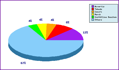 A representation of patentees who have filed the most patent families for this INN. Note the prominence of relevant applications filed by manufacturers of competing ‘sartan’ drugs, Novartis (Valsartan), Takeda (Candesartan and Azilsartan), Merck (Losartan) and SmithKline Beecham (Eprosartan); as well as the diversity of applicants represented by the significant portion outside of the top five, largely representing generic companies.