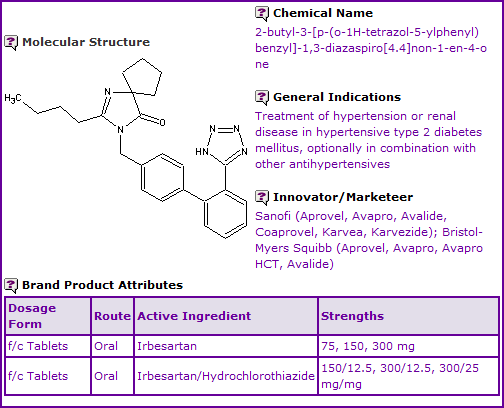 Irbesartan is currently available as oral film-coated tablets in 75, 150 and 300 mg strengths and, as a fixed-dose combination with Hydrochlorothiazide (HCTZ), in 150/12.5, 300/12.5, 300/25 mg/mg strengths. The Irbesartan molecule was discovered by Sanofi and is co-marketed under a collaborative arrangement with Bristol Myers Squibb.