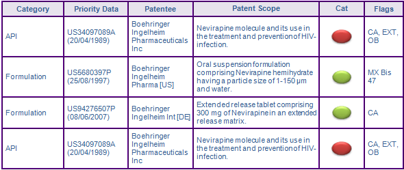 Patent families US5680397P and US94276507P protect oral formulations for Nevirapine. US5680397P claims an oral suspension formulation and a method of preparing Nevirapine hemihydrate. The family was identified through the inclusion of Mexican patents listed under article 47-bis of the Regulation of the Law of Industrial Property (data for Mexico and over 40 other countries are available for these key patent with an ‘extended’ Pipeline Developer subscription). The list was established to help COFEPRIS identify any intellectual property effecting the market authorisation of a drug, so as not to infringe any patentee’s rights. In January 2010 the Mexican Supreme Court allowed the inclusion of compositions, formulation, and uses in the list prior to this decision only API patents where included. However, the family is not considered to be a constraint to generic competition as the protected technology is likely to be circumvented by reformulation.