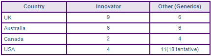 In the UK, generic authorisations have been awarded to Mylan, Hetero, Disphar, Aurobindo (Milpharm) and Morningside healthcare for the 200 mg IR formulation. Teva have also received a market authorisation for the 200 mg IR tablets via the centralised procedure. Generic authorisations were also awarded to Aurobindo and Teva for the 200 mg IR tablets following the expiry of the API patent in Canada in November 2010.