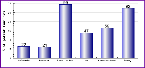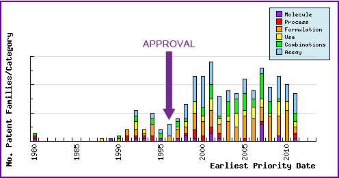 This graphic represents the timing of the earliest priority filing date for each patent family identified for this molecule as well as the type of claims found in the applications. Note the strong responsive patenting by companies post-launch, particular in the area of formulations and combinations.