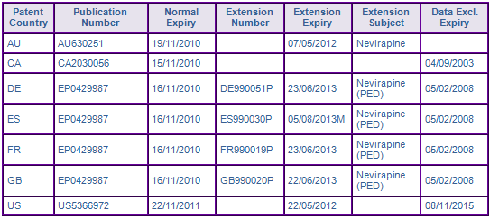 The following data is extracted from GenericsWeb Pipeline Patent Intelligence and is intended to give a brief outline of factors affecting the potential launch of generic equivalents of Boehringer Ingelheim’s non-nucleoside reverse transcriptase inhibitor (NNRTI) Viramune® (Nevirapine).