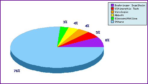 This chart shows a representation of patentees who have filed the most patent families for this INN. Overall there are over 190 individual filers. Amongst the top 5 filers are the innovator Boehringer Ingelheim and other innovator companies such as Abbott (Ritonavir/Lopinavir) and Glaxosmithkline (Efavirenz), whose presence can be attributed to general patenting regarding their anti-retroviral agents.