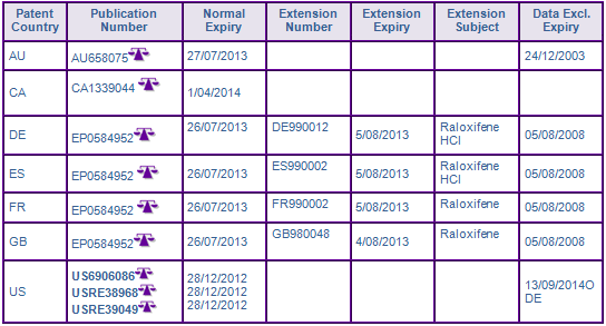 US patent RE39,050 of family US20501294A is considered to further constrain generic entry until March 2014. The patent protects the dosing regimen of administering 60 mg/day Raloxifene hydrochloride in the treatment and prevention of osteoporosis. The patent was upheld follow a paragraph IV challenge brought by Teva and was affirmed after appeal on 1 September 2010. Patent family members in Europe, Canada and Australia were withdrawn prior to grant. The above two cases outlines how vast differences in patent protection across different countries can arise.