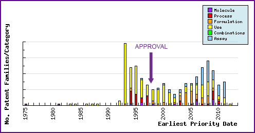 The figure below represents the timing of the earliest priority filing date for each patent family identified for this molecule as well as the type of claims found in the applications. Note the large numbers of filings of ‘use’ patents in the 5 years preceding the launch of Evista®, the majority of which were filed by Lilly. Post launch patent filing relating to formulations represent generic companies trying to circumvent innovator patents and protect their technological developments, to allow launch of generic products after expiry of patents in the constraining families.