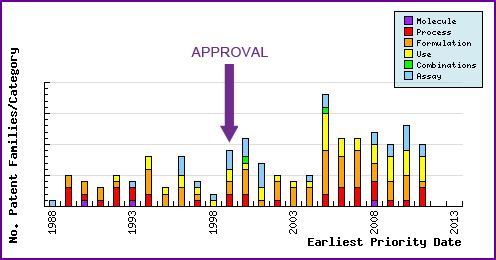 Figure 7 represents the timing of the earliest priority filing date for each patent family identified for this molecule, as well as the type of claims found in the applications. Note the strong representation of use and formulation patents from the time of approval, which mainly relate to antivirals and sialic acid inhibitors.