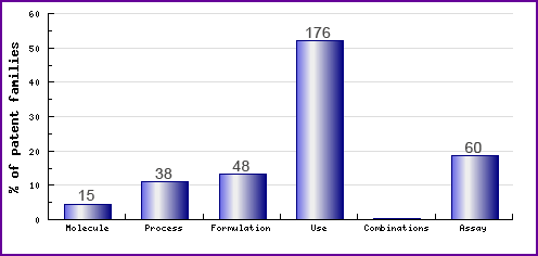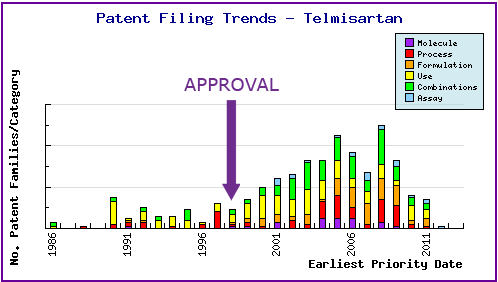 The types, number and relative distribution of patents that have been filed for Telmisartan obtained via a comprehensive patent search (Pipeline Developer report). Note the amount of filing related to the molecule, these filings comprise applications by generic companies trying to circumvent innovator patents, with the view to launch their product upon expiry of the molecule patent. The majority of ‘use’ patent filings relate to unauthorised indicated uses of Telmisartan and represent general patenting associated with the development of other innovators angiotensin II antagonists. Amongst the combination filings are patents relating to fixed dose combinations and use of combinations, and are suggestive of the attempts by generic companies to circumvent innovator patents by protecting their own Telmisartan fixed dose combinations products.