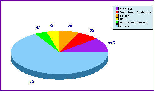 A representation of patentees who have filed the most patent families for this INN. Note the prominence of relevant applications filed by manufacturers of competing angiotensin II receptor antagonists, Novartis (Valsartan), Takeda (Azilsartan) and SmithKline Beecham (Eprosartan), who also have a stake in Telmisartan having a co-marketing arrangement with Boehringer. These represent general patents relating to the development of their angiotensin II receptor antagonists.