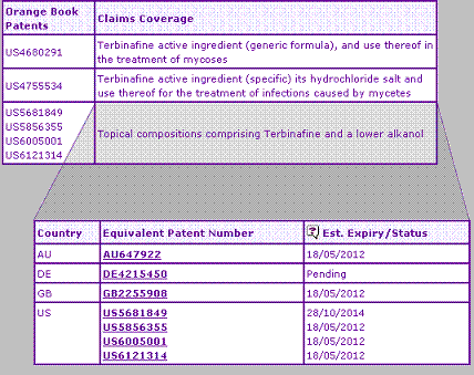The Key Patent Indicator (Table 2) shows two patent families claiming the Terbinafine active ingredient. This occurs occasionally where an active ingredient is claimed as one of many possible formulae in a first patent, then a second patent is applied for which claims certain compounds from within these formulae, based on them having superior properties (often referred to as a selection patent). In these cases both the original active ingredient patent and the selection patent must cease to be in-force prior to launch of the corresponding generic equivalent. In the case of Terbinafine, the August 2005 expiry dates in most European territories and Australia is slightly earlier than that of the corresponding US patents, which protect the active ingredient until at least December 2006, this disparity being due to differing patent term legislation and regulatory approval dates between these countries. This US active ingredient patent formed the basis of infringement proceedings by Novartis and a corresponding validity challenge by Dr Reddy’s Laboratories Ltd, which ultimately resulted in Dr Reddy’s conceding in September 2004 that the patent is valid and enforceable.