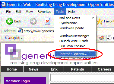 1. Go to the Toolbar and select 'Tools->Internet Options...'