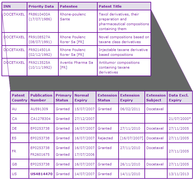 The Docetaxel Key Patent Indicator (KPI) (Table 2) identifies four patent families as being of significant commercial relevance to the Taxotere products. The patent family with priority number FR8610400A protects the Docetaxel molecule per se. The patent expiry data for this family shows that the Docetaxel molecule firstly lost protection in Spain in 2007 due to a rejection of a Supplementary Protection Certificate (SPC) application. Canadian patent protection for the Docetaxel molecule also ended in 2007 as the normal term expired, and there is no patent term extension provisions in Canada. In contrast, the US and other major European equivalents have longer patent protection due to granted PTE or SPCs in these jurisdictions. Patent, US4814470 expired last month after the term of the 6 month paediatric extension, in addition to the USC section 156 PTE of 1035 days. SPCs on the European equivalents in this family also expired last month in major territories. Similarly, a section 70 PTE in Australia allows the Docetaxel molecule patent to be in force until February 2011 due to a later TGA approval date.
