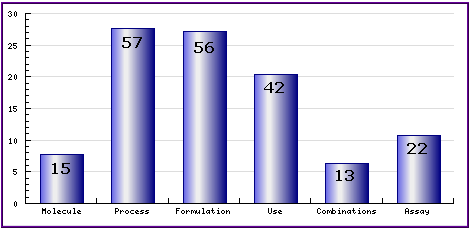 The types, number and relative distribution of patents that have been filed for Quetiapine obtained via a comprehensive patent search (Pipeline Developer report). Note that there exists a roughly equal number of process and formulation patents. Of the process patents identified, the majority relate to the complete synthesis of Quetiapine.