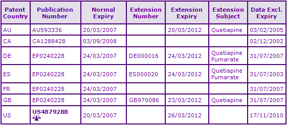 At the time of publication, patents within the original API family are still valid in certain countries and hence are potentially preventing the launch of generics. In several European states, the European patent in this family has had Supplementary Protection Certificates (SPCs) granted with expiries of March 2012, however it should be noted that in certain European countries, the patents claim processes for the preparation of Quetiapine and as such may be circumvented.