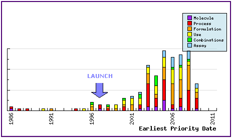 Represents the timing of the earliest priority filing date for each patent family identified for this molecule as well as the type of claims found in the applications. Note the consistent patenting by generic companies post-approval (1997 for Seroquel IR in the US) in the area of process, use and formulation, and the relative increase in formulation patent filings following approval of Seroquel XR (2007-2008).