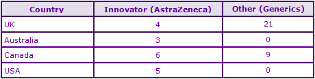 Currently, the only major market where generic Zolmitriptan has been identified is Canada. The Canadian patent protecting the Zolmitriptan molecule expired on 6 June 2011 (see Figure 3) and the following day, Mylan, Pharmascience, Ratiopharm, Sandoz and Teva all launched generic versions of the orally disintegrating tablet and/or the immediate-release oral tablet formulations. The speed at which these generic products were launched in Canada following patent expiry is indicative of the extensive interest shown by generic companies and suggests that such oral Zolmitriptan formulations will go generic heavily upon equivalent patent expiry in other countries.