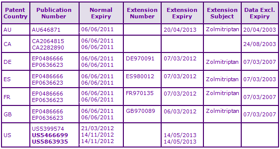 The last identified key patent family, in which the patents have expiries of November 2020, relates to buffered Zolmitriptan formulations suitable for intranasal administration.