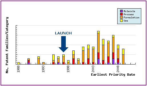 Represents the timing of the earliest priority filing date for each patent family identified for this molecule as well as the type of claims found in the applications. Since the approval of Zolmitriptan (1997 in the UK/US and 1998 in Australia/Canada) there has been considerable and consistent patent activity in the area of process and formulation, which has been further influenced by the subsequent approval of the nasal spray formulations (2003 in the US).