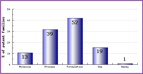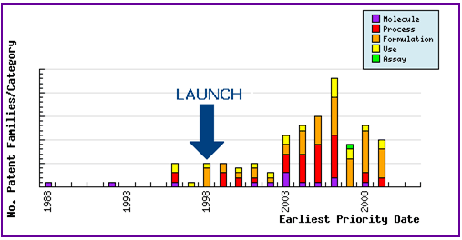 Represents the timing of the earliest priority filing date for each patent family identified for this molecule as well as the type of claims found in the applications. Since the approval of Tolterodine (1998 in the US/UK) there has been consistent patent activity in the area of molecular form and process. Furthermore, since the subsequent approval of the sustained-release formulation (2000/2001 in the US/UK) several generic companies have submitted patent filings relating to modified-release formulations.