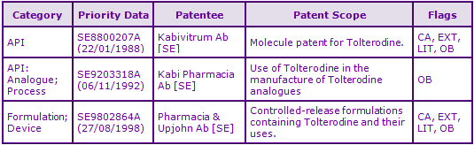 Figure 2: Key Patent Indicator; the most significant patents protecting products containing Tolterodine