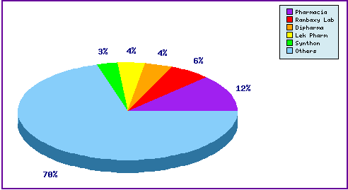 Represents patentees who have filed the most patent families for this INN. Note the prominence of generic players in the top five e.g. tentative FDA approval holders Ranbaxy And Sandoz (LEK) as well as the diversity of applicants represented by the large portion outside the top five.