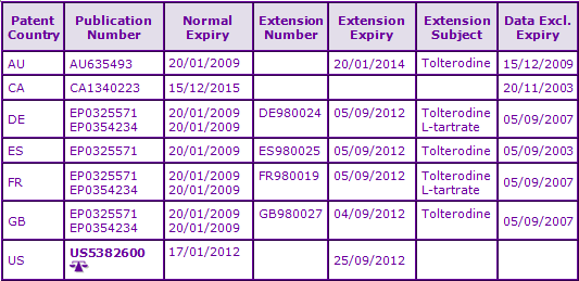 The third patent family, SE9802864A, is derived from four separate PCT applications and the patents have expiries of 2019 in most major territories. This family, containing FDA Orange Book and Canadian Patent Register listed patents, relates to the controlled/sustained-release oral Tolterodine formulations having specific release characteristics and their use in the treatment of urinary incontinence. Patents in this family are the subject of litigation in the US and opposition in Europe by generic competitors and therefore may be considered a strong constraining factor for the prevention of generic sustained-release formulations of Tolterodine. A broad European patent in this family has recently been granted and is still within the opposition period. It is unlikely to proceed unopposed by major generic manufacturers as it appears to be the only major constraint to generic sustained release Tolterodine products in Europe.